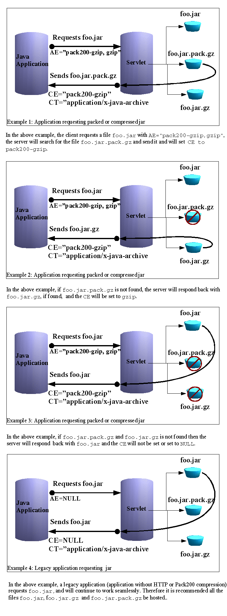 The server implementation will search for the requested JAR file with .pack.gz or .gz file extension and respond back with the located file. The server will set the response header Content-Encoding (CE) field to pack200-gzip , gzip, or NULL depending on the type of file that is being sent, and optionally may set the Content-Type (CT) to application/Java-archive. Therefore,  by inspecting the CE field, the requesting application can apply the corresponding transformation to restore the original JAR file.