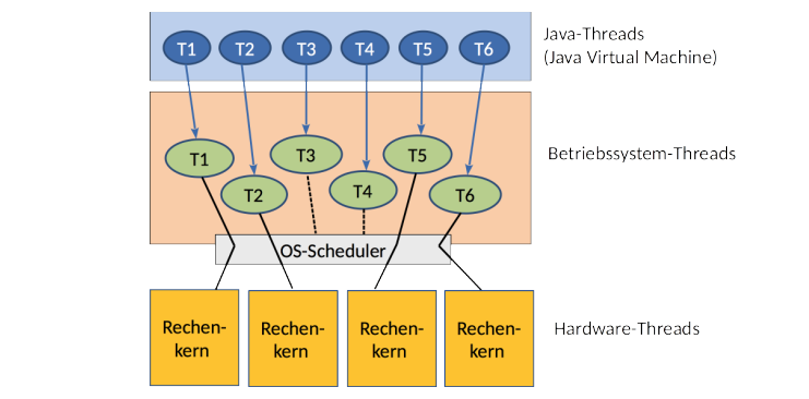 Thread ab und überschreibt die run-Methode.Runnable-Interface implementiert. Ein Objekt dieser Klasse wird auch oft als Task bezeichnet. Es wird dann einem Thread-Objekt zur Ausführung übergeben.Die so vorbereitete Thread-Instanz wird durch Aufruf der Methode start() zur nebenläufigen Abarbeitung markiert. Der Java-Scheduler sorgt dafür, dass Kontextwechsel zu diesem Thread erfolgen bzw. dass er in einer Execution-Engine (“Prozessor”) abgearbeitet wird. Wann Wechsel zu diesem Thread erfolgen, liegt aber in der Verantwortung des Schedulers, der eine eigene Strategie verfolgen kann. Die Priority Eigenschaft des Threads sollte dabei berücksichtigt werden.