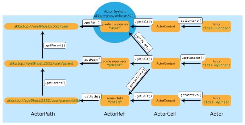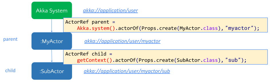 Akka.system() ist “Wurzel”-KontextProps.create(…): hier Implementierungsklasse des Aktors angeben – z. B. MyActoractorOf ein Akka-interner Name angegeben werden, über den der Aktor identifiziert werden kannhttps://doc.akka.io/docs/akka/current/general/ActorPath.png (abgewandelt)